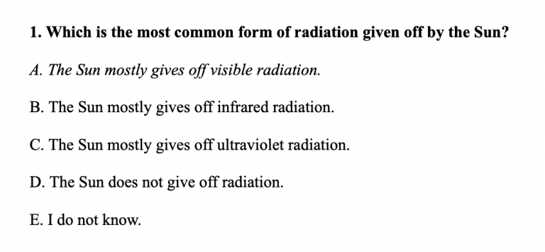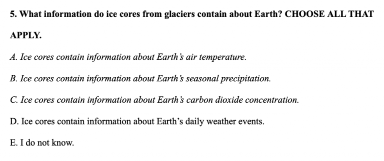 The CCCI was designed to assess students’ conceptual understanding of climate change science and common misconceptions. CCCI has 21 multiple-choice items (mix of single-response and multiple-response)